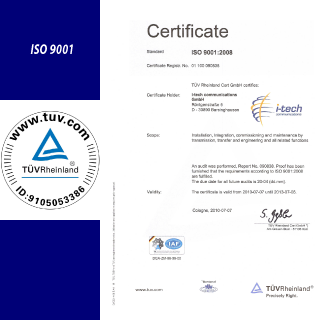 ISO 9001 certification i-tech communications GmbH is officially ISO 9001:2008 certified in accordance with TÜV Rheinland. This quality standard is accredited for installation, commissioning and maintenance of the technology of transfer and dial switching including all related services.