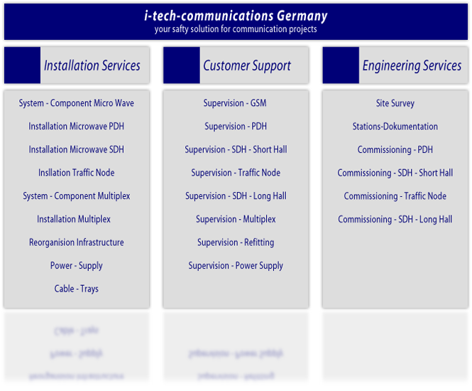 Unsere individuellen Konzepte für zuverlässige Kommunikationstechnik sind Komplettlösungen in den Bereichen Installation Service - Customer Support - Engineering Service.